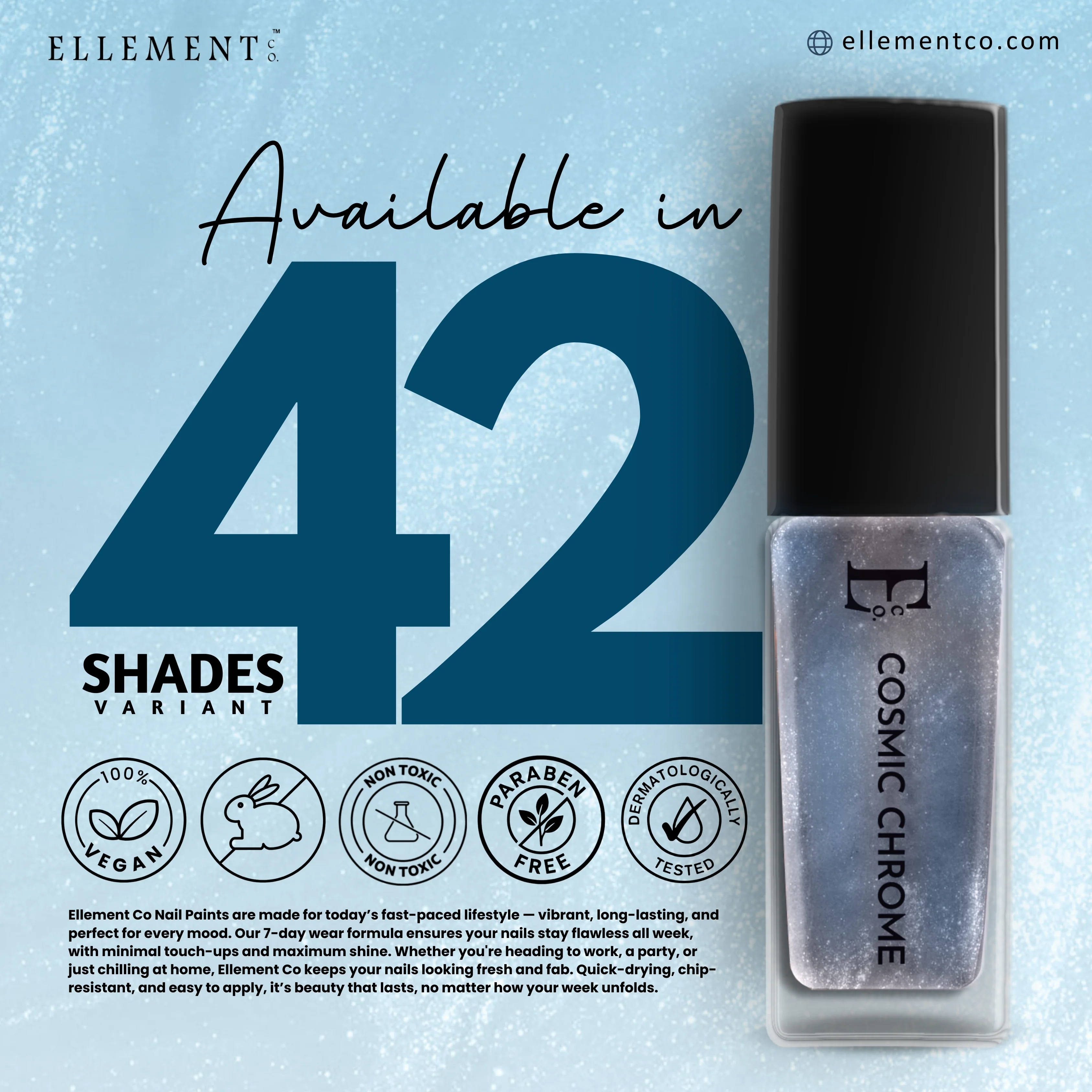 Elevate your nail art with Ellement Co.'s Blue Metallic Nail Polish - Cosmic Chrome. This chip-resistant, non-yellowing formula delivers a brilliant metallic shine that enhances any nail art. Achieve intense colour payoff and a glossy finish that lasts up to 7 days. Crafted to strengthen and nourish nails, its gel-like texture ensures effortless application with our unique double flat-wide U-cut brush. Perfect for those seeking a vibrant, long-lasting blue metallic shimmer nail polish to elevate their nail game.