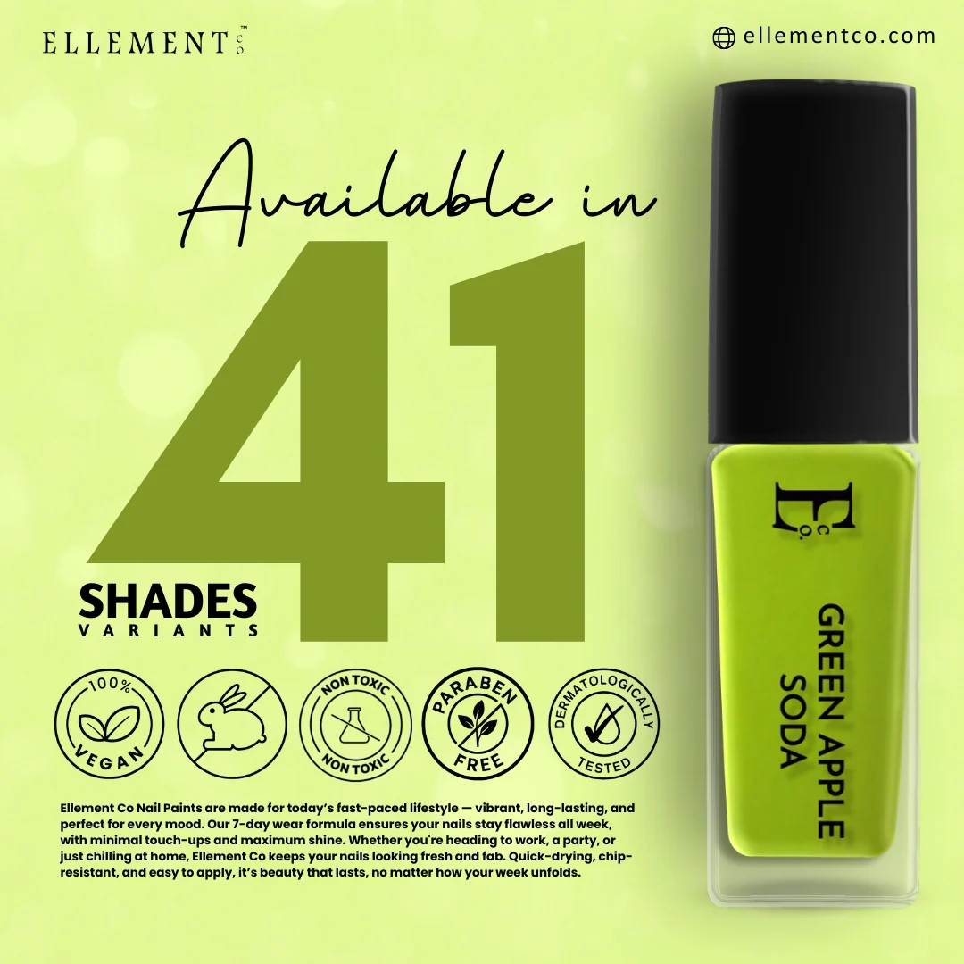 Elevate your nail art with the Ellement Co. Green Pop Nail Polish in Green Apple Soda, 10 ml. This vibrant green nail polish is your go-to pop nail polish for standout nails. Formulated to resist chipping and yellowing, it delivers an intense colour payoff and a brilliant, neon finish. Designed to strengthen and nourish nails, its gel-like formula ensures lasting shine for up to 7 days. Complete with a double flat-wide U-cut brush for effortless, one-stroke application, it's the perfect neon nail polish for your nails to shine bright with every stroke.