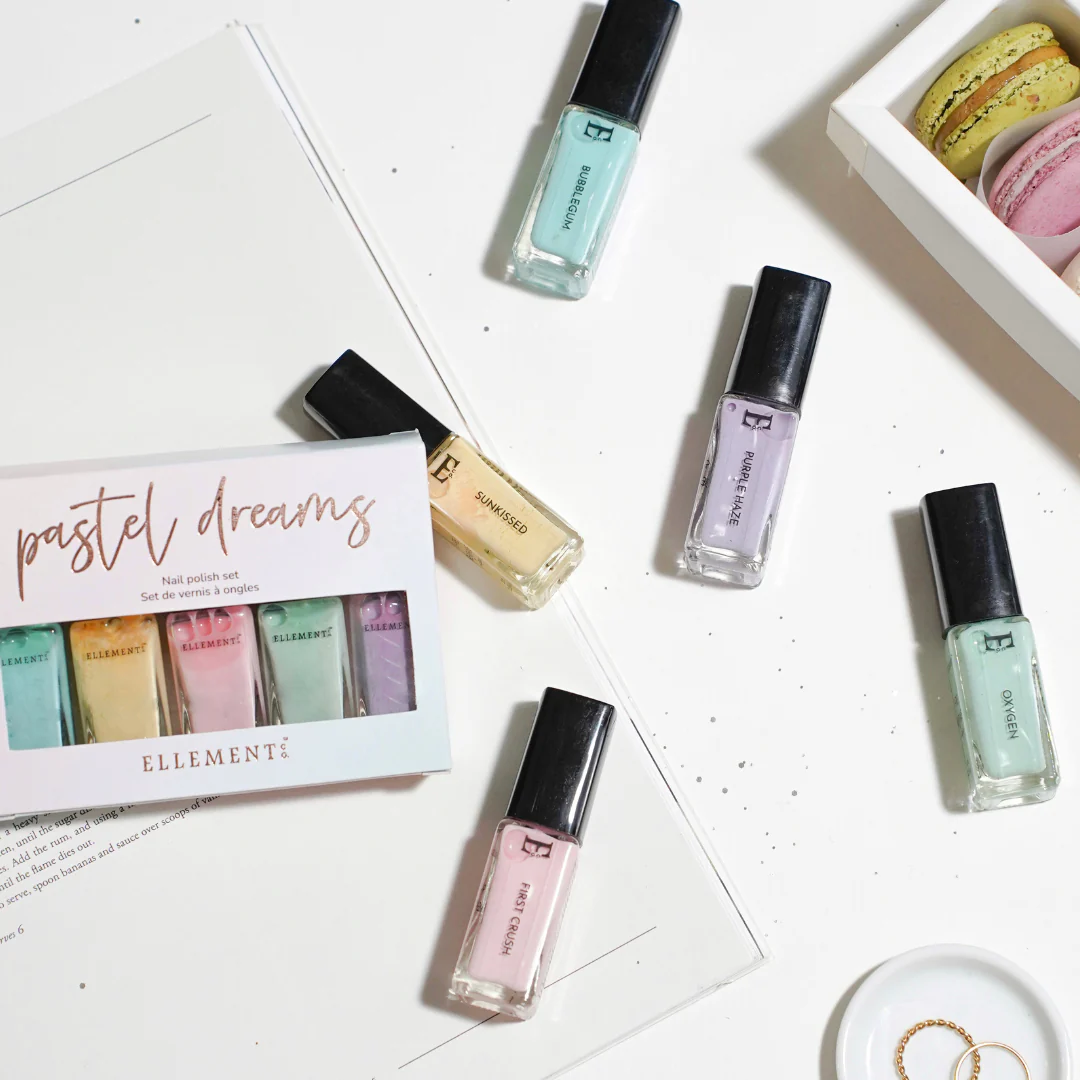 Elevate your nail art with the Pastel Dreams Nail Polish Set - a curated set of nail polish shades including First Crush, Purple Haze, Sunkissed, Oxygen, and Bubblegum Nail Polish.